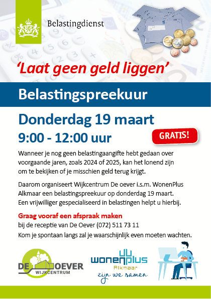 Wanneer je nog geen belastingaangifte hebt gedaan over voorgaande jaren, zoals 2024 of 2025, kan het lonend zijn om te bekijken of je misschien geld terug krijgt. Daarom organiseert Wijkcentrum De oever i.s.m. WonenPlus Alkmaar een belastingspreekuur op donderdag 19 maart. Een vrijwilliger gespecialiseerd in belastingen helpt u hierbij. Graag vooraf een afspraak maken bij de receptie van De Oever (072) 511 73 11 Kom je spontaan langs zal je waarschijnlijk even moeten wachten.