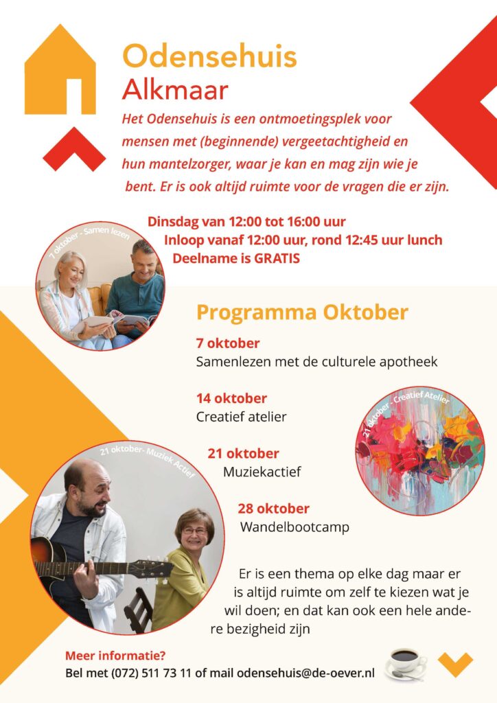 Het Odensehuis is iedere dinsdag van 12.00 tot 16.00 uur, met om 12:45 een lunch, in Wijkcentrum De Oever Amstelstraat 1, Oudorp Alkmaar.