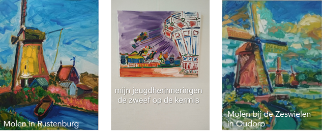 Naast dit werk heb ik een serie jeugdherinneringen doekjes geschilderd. Nu ik wat ouder ben kan ik terugkijken op een jeugd die mij heeft geïnspireerd heeft om hieraan te werken. Vliegeren, een sneeuwpop maken, met de familie naar het strand etc. 50 tot 60 jaar geleden zag het leven er heel anders uit, dat laat ik met dit werk zien.