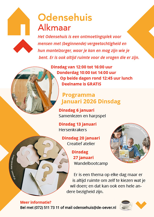 Het Odensehuis is een ontmoetingsplek voor mensen met (beginnende) vergeetachtigheid en hun mantelzorger, waar je kan en mag zijn wie je bent. Er is ook altijd ruimte voor de vragen die er zijn.