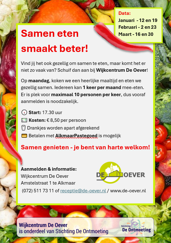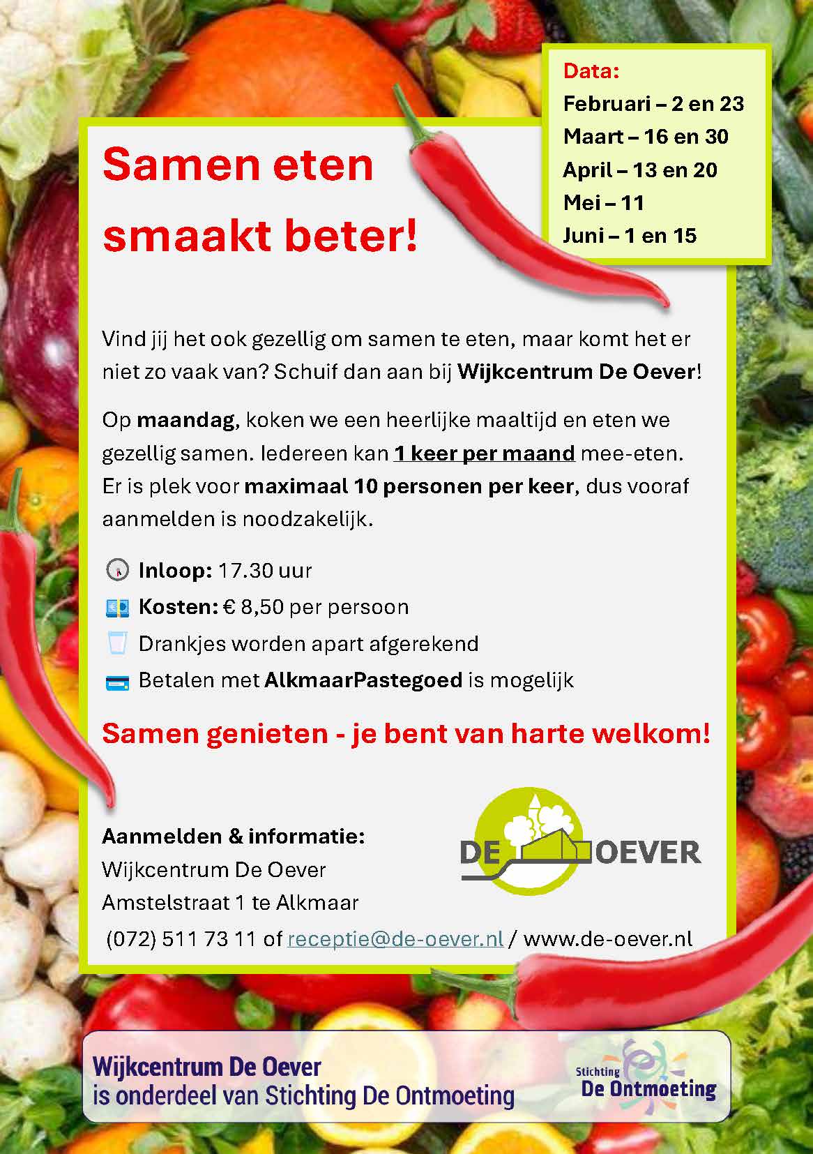 U heeft de mogelijkheid om 1x in de maand aan te schuiven. Marja haalt inspiratie uit verschillende landen, elke maand een gerecht uit een ander land, denk aan Italië, Indonesië, Spanje enz. De maaltijd bedraagt € 8,50 exclusief de drankjes die na de maaltijd worden afgerekend bij de kassa. Iedereen die even niet alleen wil eten of geen zin heeft om te koken is van harte welkom!