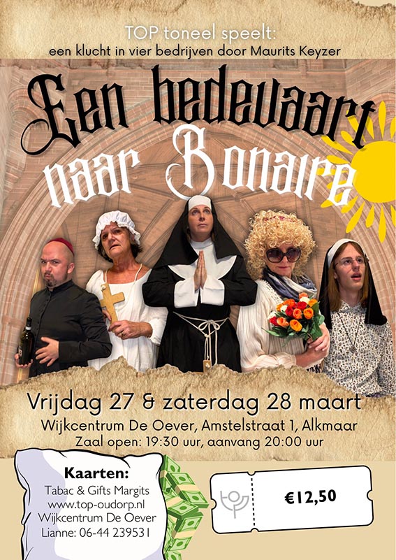 Na twee uitverkochte avonden is TOP toneel volgend seizoen opnieuw terug! Voorstellingen vrijdag 27 maart en zaterdag 28 maart 20.00 uur. We zijn een gezellige vereniging en hebben Oudorp en Wijkcentrum De Oever als basis. Wij oefenen vanaf oktober elke woensdagavond om 19.30 uur in De Oever. Ben je geïnteresseerd in het kijken of deelnemen? Stuur een e-mail en je bent van hart Uitgenodigd om langs te komen! Na onze zomerstop (en ons jaarlijks verenigingsuitje) beginnen we in het najaar met het schrijven van een nieuw, humoristisch stuk. U komt zeker ook?